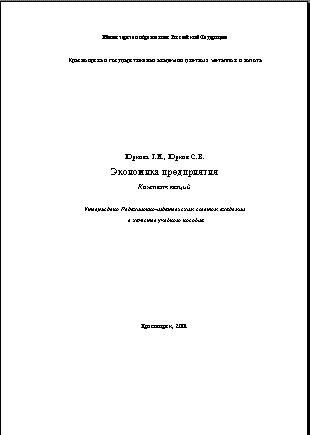 УДК [338+658](075) ББК 65.5 Ю 75 Рецензенты: Р. Р. Бурменко – к. э. н., доцент Красноярской академии цветных металлов и золота; Л. В. Ерыгина – к. э. н., доцент Сибирской аэрокосмической академии. Ю 75 Экономика предприятия: Конспект лекций; ГАЦМиЗ. – Красноярск, 2001. – 109 с. Рассматриваются предприятия различных форм собственности. Особое внимание уделяется вопросам эффективности использования их производственных ресурсов: основных средств, нематериальных активов, оборотных средств, рабочей силы. Для студентов специальности 060800 -"Экономика и управление на предприятии". ISBN 5-8Cover.gif150-0087-6 Ó Красноярская государственная академия цветных металлов и золота, 2001 |