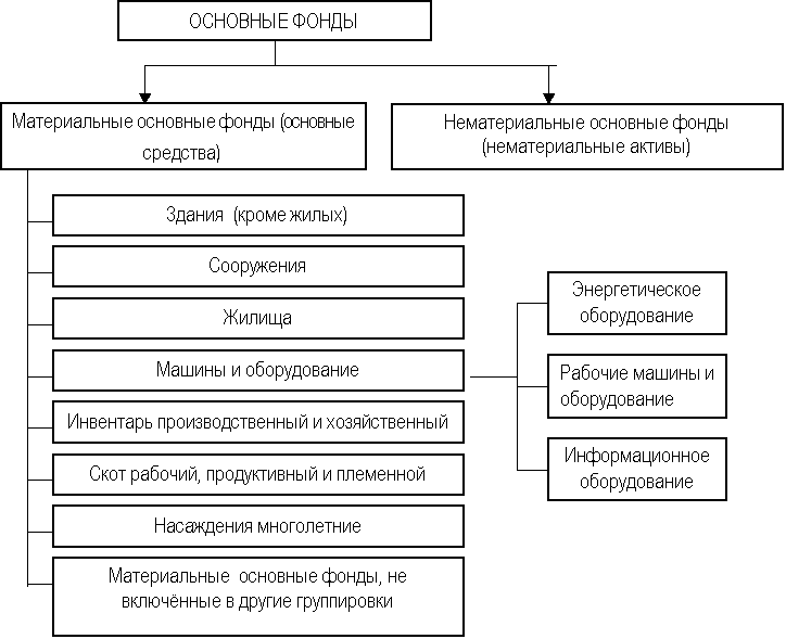 ТЕМА 2. ОСНОВНЫЕ СРЕДСТВА ПРЕДПРИЯТИЯНаиболее высокую долю в структуре имущественного комплекса предприятия занимают основные фонды. Основными фондами являются произведенные активы, используемые неоднократно или постоянно в течение длительного периода, но не менее одного года, для производства товаров, оказания рыночных и нерыночных услуг. Основные фонды делятся на материальные и нематериальные (рис. 3). К материальным основным фондам (основным средствам) относятся здания, сооружения, машины и оборудование, измерительные и регулирующие приборы и устройства, жилища, вычислительная техника и оргтехника, транспортные средства, инструмент, производственный и хозяйственный инвентарь, рабочий, продуктивный и племенной скот, многолетние насаждения и прочие виды материальных основных фондов. К нематериальным основным фондам (нематериальным активам) относятся компьютерное программное обеспечение, базы данных, оригинальные произведения развлекательного жанра, литературы или искусства, наукоемкие промышленные технологии, прочие нематериальные основные фонды, являющиеся объектами интеллектуальной собственности, использование которых ограничено установленными на них правами владения. Материальные и нематериальные основные фонды показываются в балансе предприятия в разделе "Внеоборотные активы". Объединяет эти виды ресурсов предприятия не только то обстоятельство, что они играют важную роль в деятельности предприятия, но и то, что объекты, включаемые в состав основных фондов, используются в течение длительного времени (более одного года). Однако при ближайшем рассмотрении оказывается, что основные средства и нематериальные активы имеют большие различия, которые отражаются в методах их учета, анализе использования и влиянии на финансовый результат. Рассмотрим основные средства предприятия. ТЕМА 2. ОСНОВНЫЕ СРЕДСТВА ПРЕДПРИЯТИЯ 2.1. ОСНОВНЫЕ СРЕДСТВА, ИХ СТРУКТУРА И КЛАССИФИКАЦИЯ 2.2. УЧЕТ СТОИМОСТИ ОСНОВНЫХ СРЕДСТВ 2.4. АМОРТИЗАЦИЯ ОСНОВНЫХ СРЕДСТВ |